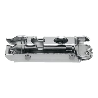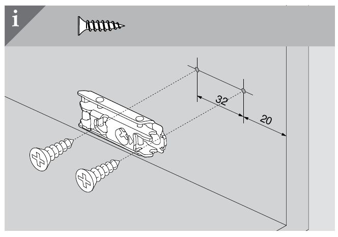 Blum offer a wide range of attachment options for connecting the hinge plate to the cabinet. I go for the simplest option which is just fixing with screws that you provide yourself. They also offer Expando, Inserta, System Screw, and two forms of Knock In. All but the screw design are aimed at cabinet shops that have jigs or dedicated machines for drilling the required holes.