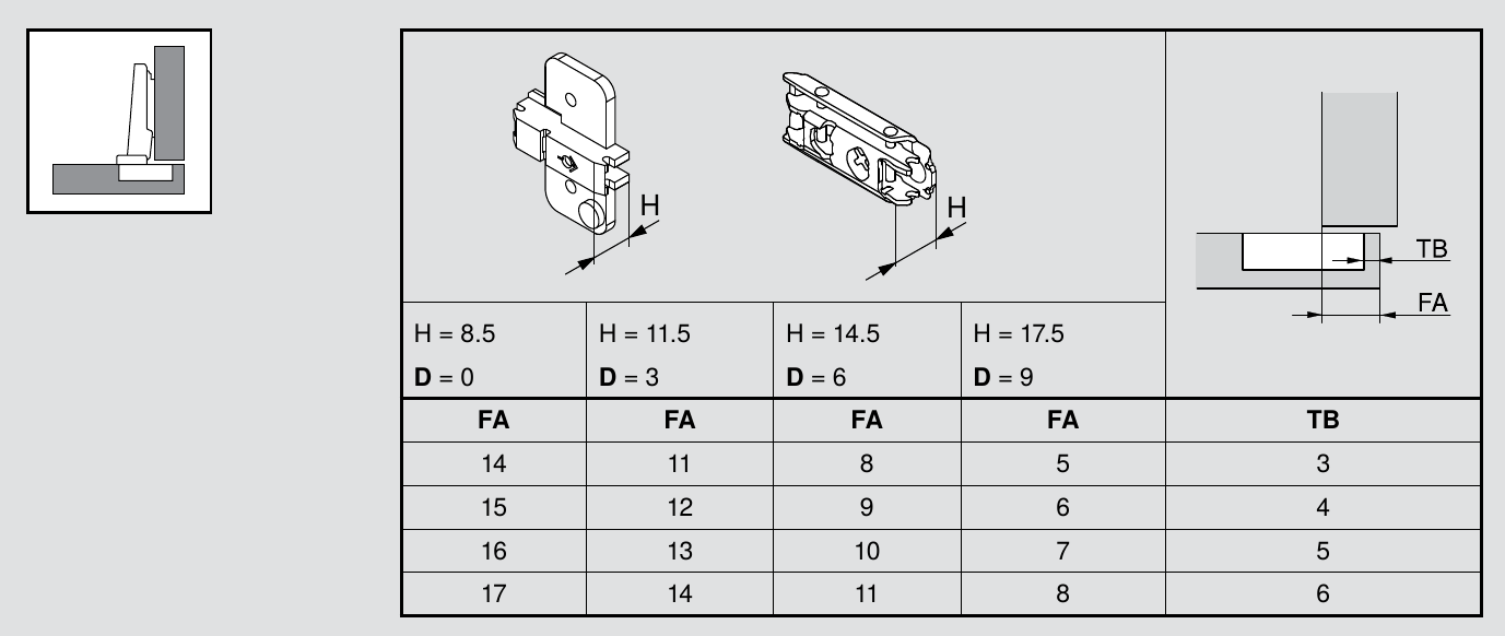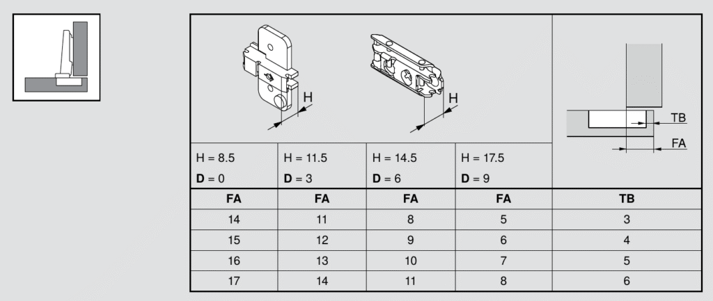 FA is the amount of overlay and is usually the setting that I let drive the others. For example, let’s say you want 16mm of overlay. To achieve that you’ll need a D=0 hinge plate and a set back of 5mm for the hinge cup hole. Take note of the TB value as that is needed in a moment.