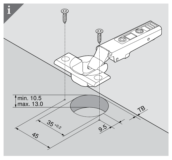 The hinge cup hole has to be accurately drilled to 35mm and at least 10.5mm deep. I don’t think the maximum matters that much although it’s mentioned on the diagram as 13mm. A good quality Forstner bit is a must for this hole. A drill press is not mandatory but it’s definitely a nice to have.