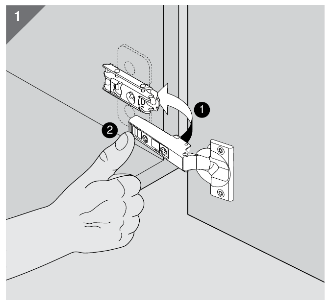 Attaching the hinge to the hinge plate is very easy. At the front of the plate are a couple of hooks and the back of the hinge has a spring loaded clip. Just hook the hinge on the front of the hinge plate and then press the back until it clicks.
