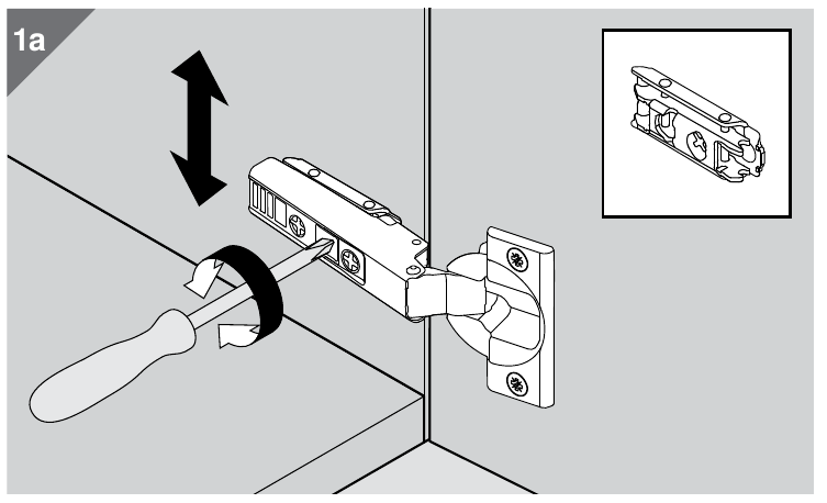 Shown below is the vertical adjustment for the hinge plate type in this example. The various hinge plate designs have different adjustment mechanisms but they are all the same basic idea.